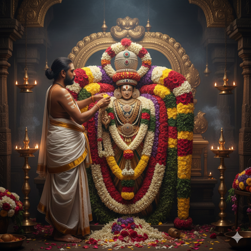 Participating in the flower garland offering for the decoration of the Lord and Goddess following the Abhishekam.